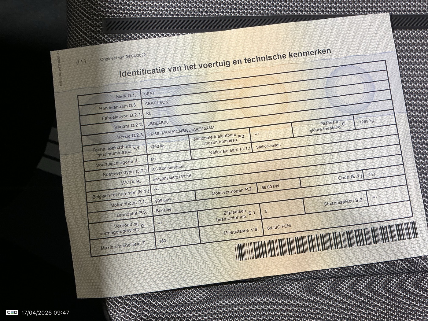 Indice de vitesse avant V